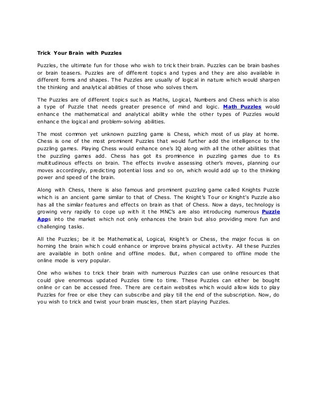 10 Puzzles To Help Improve Brain S Function from cdn.slidesharecdn.com Here are some other tips. Working on puzzles can help your brain feel '10 years younger'. Some lifestyle experts claim that all puzzles can do is teach you how to solve them better and that they have no real life application. Doing puzzles can be considered a complete brain exercise since it exercises both the right and left sides. And the left is the logical, objective and methodical side. Jigsaw puzzles, in particular, may help you relax and reduce stress, according to research published in frontiers in aging neuroscience. Apr 24, 2009 · puzzles seem to tap into a universal part of brain functioning, even though they may appear in different cultural forms. Crosswords are fun and may improve your ability to find words, but they don't help your brain's overall cognition or memory a lot of people do crossword puzzles each day with the belief that this activity will help keep the brain young and even keep alzheimer's or dementia at bay.